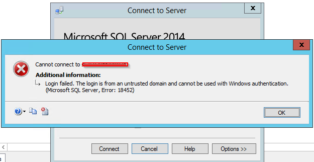 untrusted domain and cannot be used with Windows authentication. [CLIENT: xx.xx.xx.x]